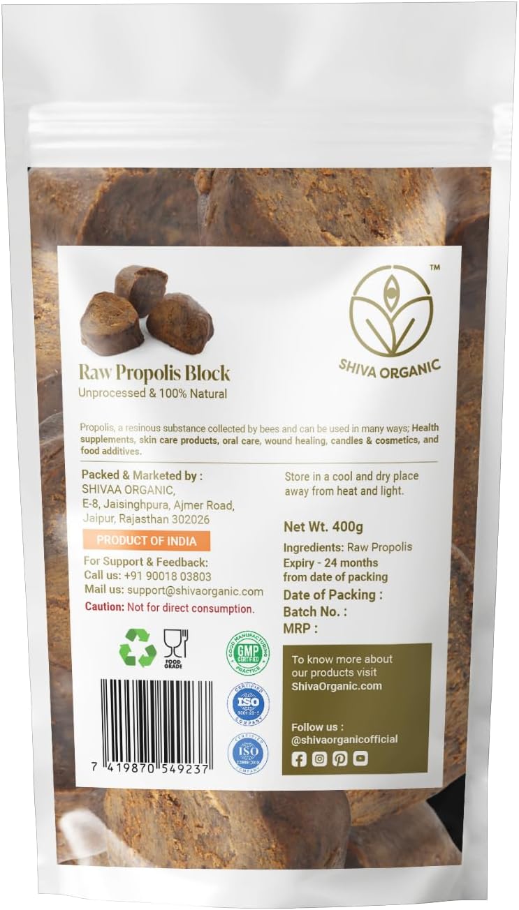 Neupravený surový propolis priamo z úľov, zachovávajúci všetky prirodzené látky. Tento tmavý, živicovitý produkt má intenzívnu vôňu a mierne horkú chuť. Včely zbierajú živice z púčikov stromov a používajú ich na ochranu úľa. Propolisový blok je univerzálny produkt, ktorý možno používať rôznymi spôsobmi. Balený vo vzduchotesnom obale zachováva svoju čerstvosť a kvalitu. Pochádza z ekologických pasiek, kde včely žijú v prirodzenom prostredí.